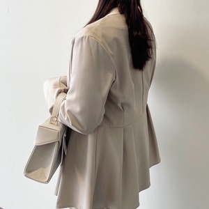 ノーカラーペプラムジャケットは、シンプルなデザインに女性らしさをプラスした魅力的な一着です。ノーカラーのスタイルは洗練された印象を与え、ペプラムのシルエットがウエストを美しく強調します。ベージュとブラックの2色展開で、デイリースタイルからビジネスシーンまで幅広く活躍できるアイテムです。オフィスやお出かけにぴったりな、着回し力抜群のジャケットです。