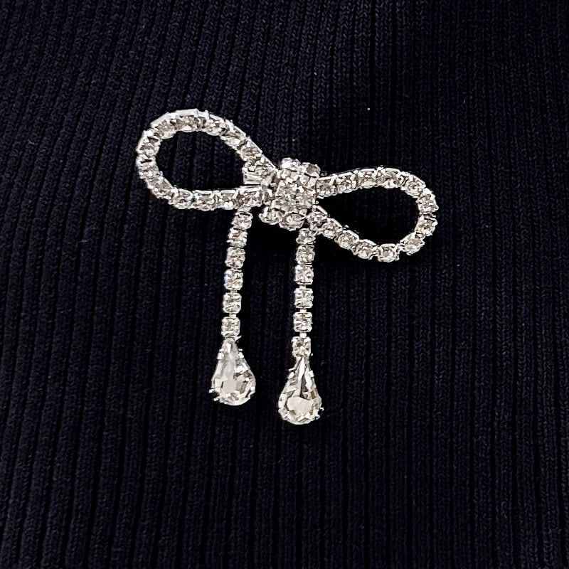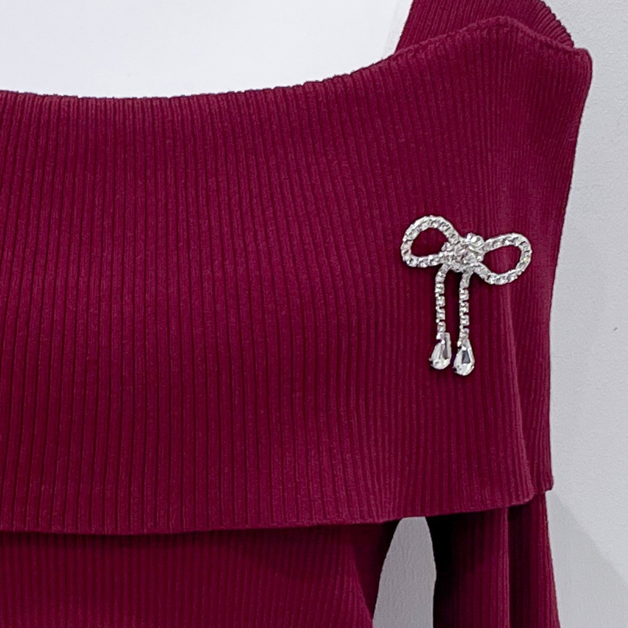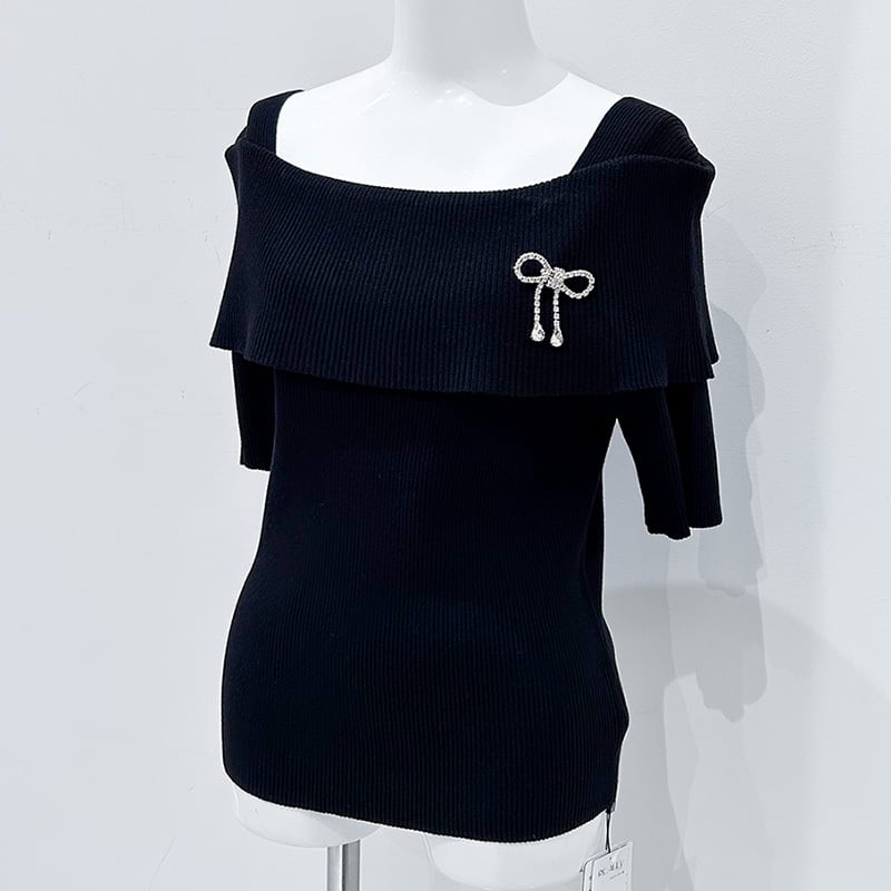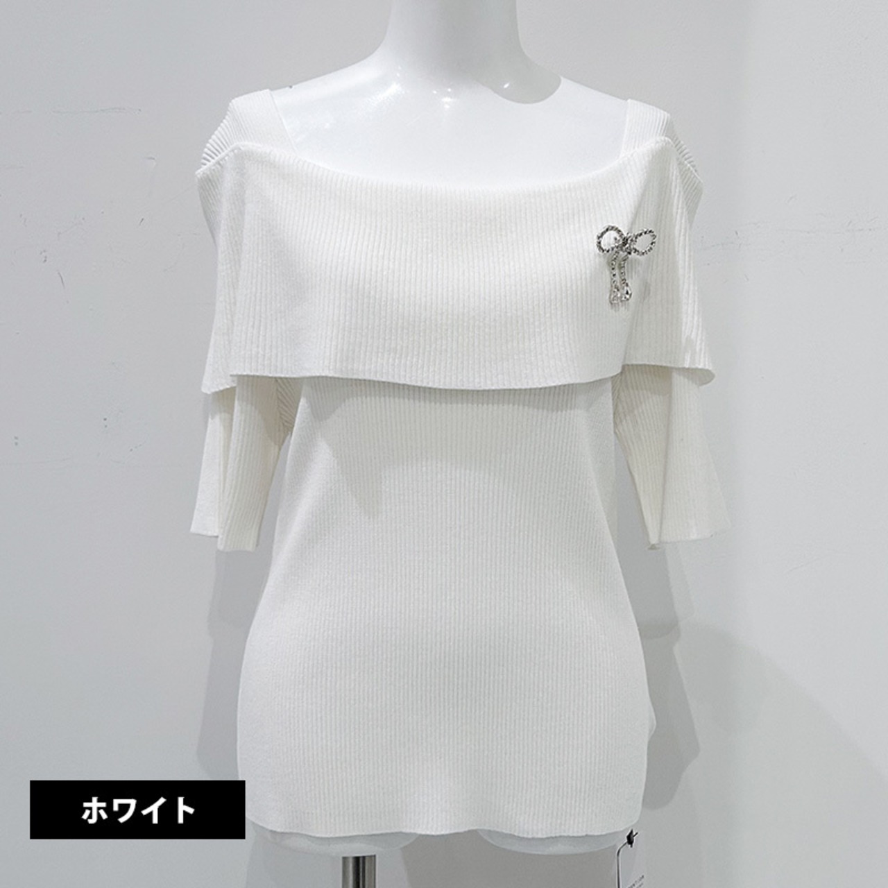 リボンブローチ付オフショルニット オフショルニット レディース オフショルニット 上品 フェミニン 20代 30代 40代 ホワイト ワイン ブラック