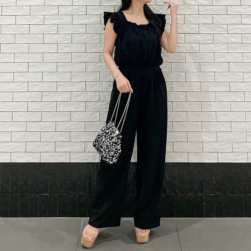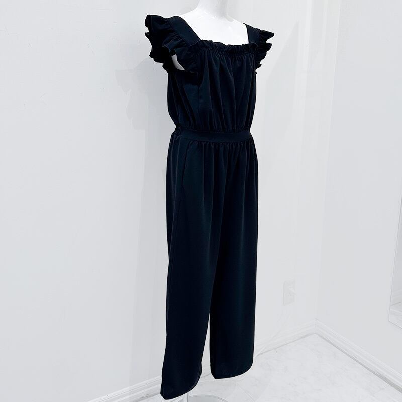 女性らしさを引き立てるフリルデザインが特徴の一着フリルオールインワン。シックなブラックカラーで、カジュアルなお出かけから特別なイベントまで幅広くご活用いただけます!このオールインワンは、スタイリングの手間を省きながらも、洗練された印象を与えることができる理想的なアイテムです。お呼ばれにもぴったりな一枚!
