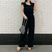 フリルオールインワン レディース オールインワン フリル カジュアルオールインワン フリル付き お出かけコーデ 20代 30代 40代 ブラック