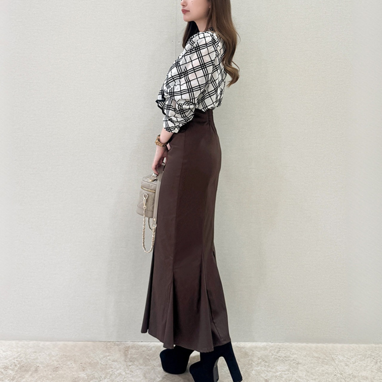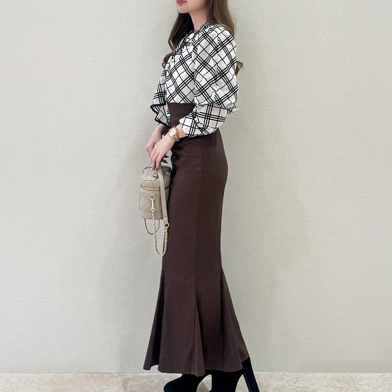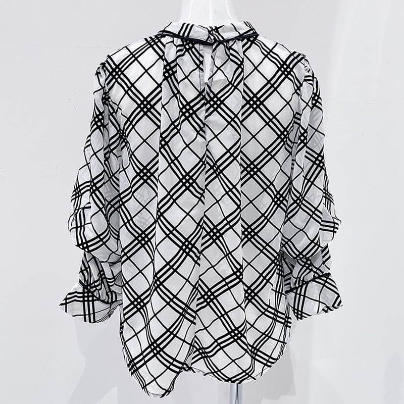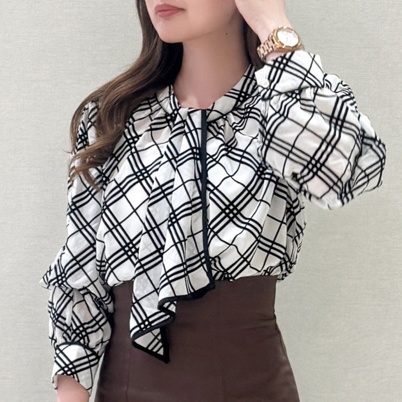 フロッキーチェック棒タイブラウス レディース ブラウス チェックブラウス 棒タイブラウス チェック柄ブラウス 秋冬 大人かわいい 20代 30代 40代 ホワイト・ベージュ・ブラック