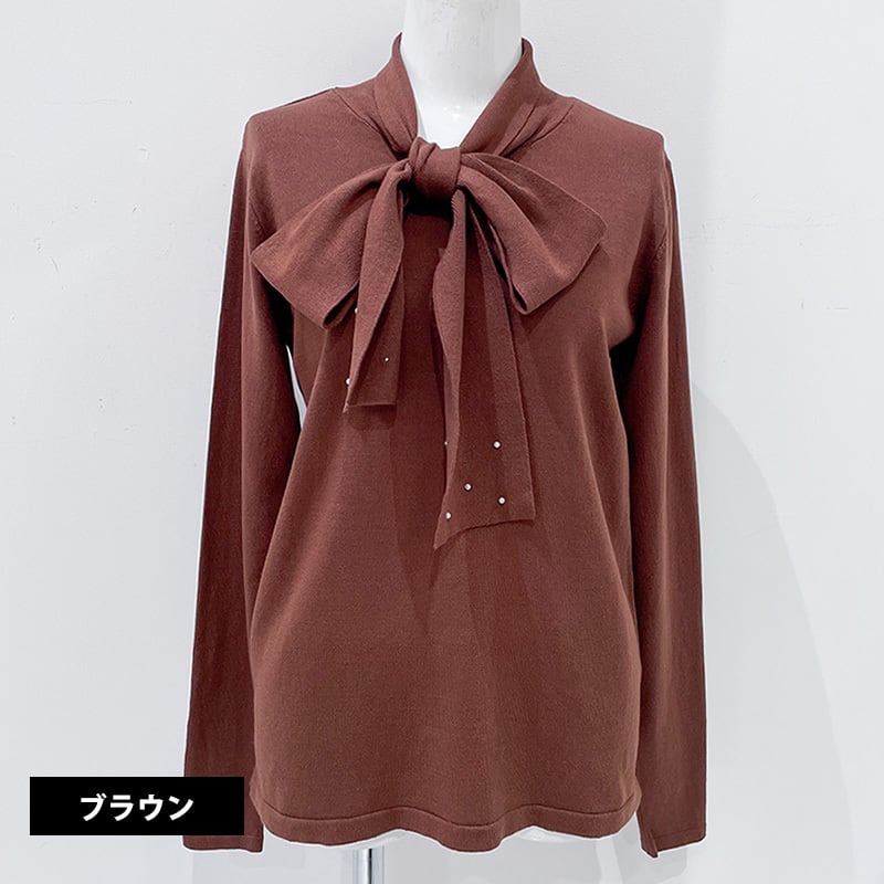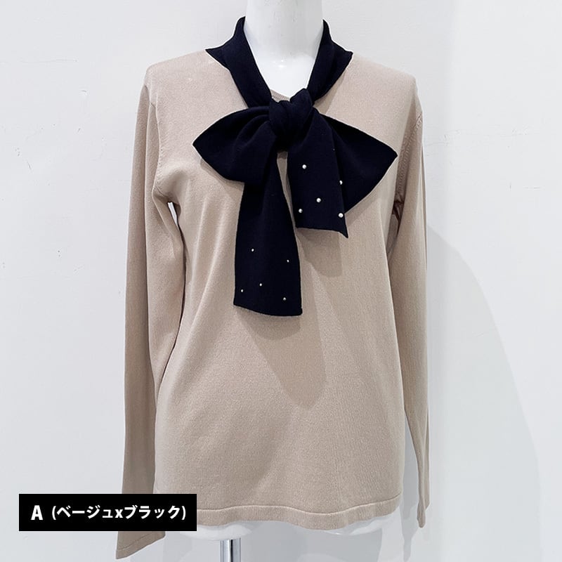 RE:ALLY リアリーオリジナル パール付リボン棒タイニット レディース パール付きニット ボウタイニット バイカラー 配色 フェミニンニット トップス 大人 きれいめ コーデ 20代 30代 40代 ベージュ ブラウン ピンク