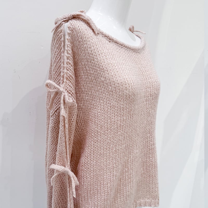 ふわっとしたモヘアタッチの素材がシーズンムードを高めてくれる、主役級ニット!最大のポイントは、袖に大胆に入ったスリットデザインと、そこに並ぶリボンディテール。肌見せの抜け感と可愛らしさが一度に叶う、他にはないアイテムです。ボディはシンプルで合わせやすく、袖のデザインがしっかり映えるバランス。ゆったりとしたスリーブが女性らしい柔らかさを演出し、スカートにもパンツにもマッチします。華やかさはありつつも甘すぎず、20〜30代の大人可愛いスタイルにぴったり♩一枚でコーデを完成させてくれる、冬のおすすめニットです。