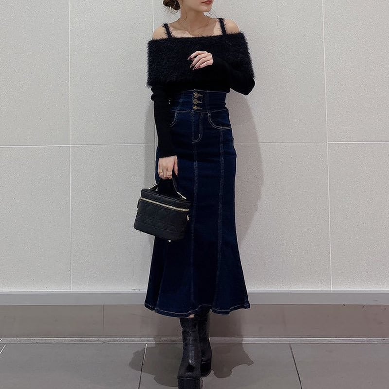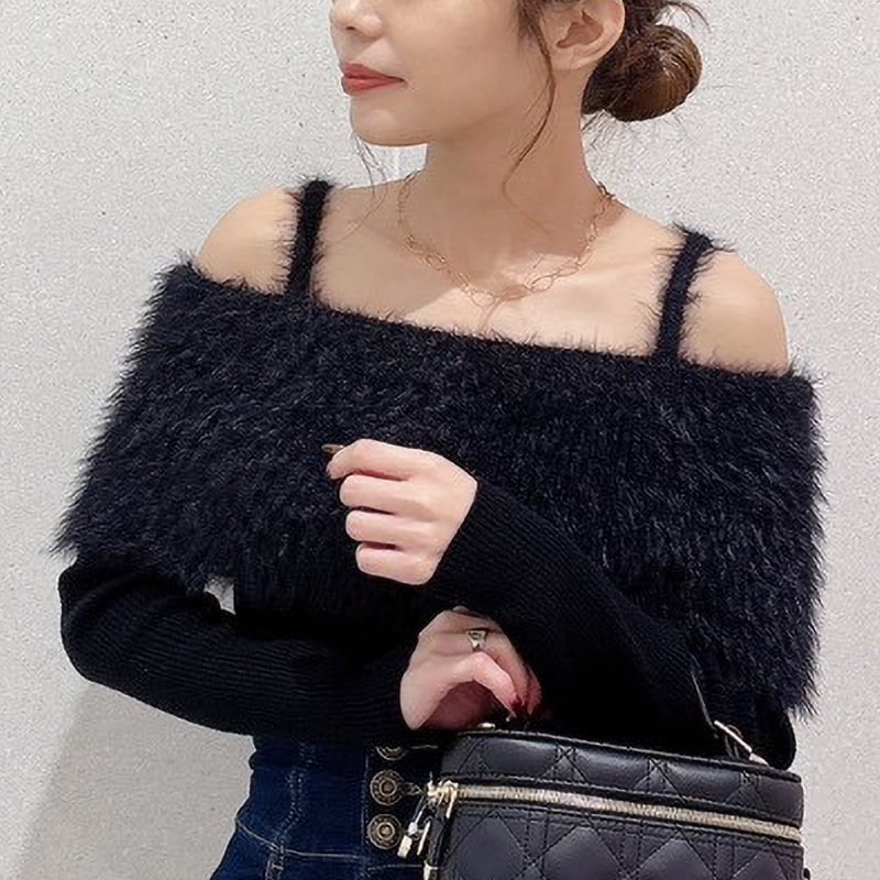 ふわふわのシャギー素材が目を惹く、主役級のオフショル風ニット。肩の華奢なストラップとオフショルデザインが女性らしさを引き立て、デコルテをきれいに見せてくれます。身頃はリブ編みで程よくフィットし、メリハリのあるシルエットに♩1枚で華やかさと抜け感が叶う、デートにもお出かけにもおすすめのアイテムです!