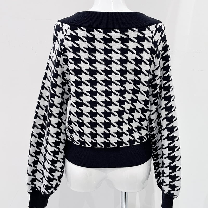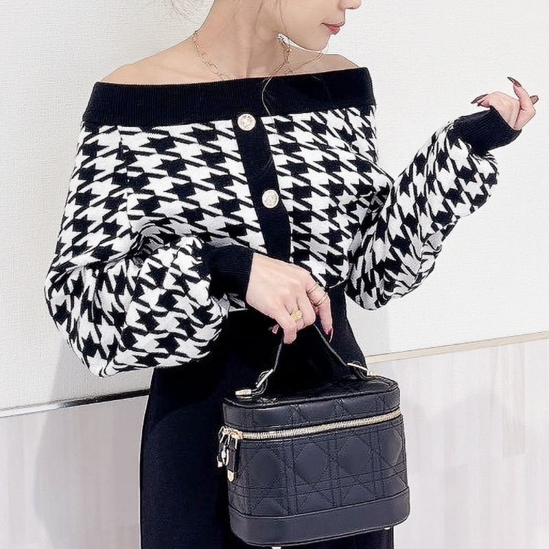 オフショル×千鳥柄の組み合わせが大人かわいい主役級ニット。上品なデコルテ見せが叶うオフショルデザインに、存在感のある千鳥柄が華やかさをプラス。フロントにはアクセサリーいらずの金ボタンがあしらわれ、1枚でスタイリングが決まる優秀アイテムです♩ふんわりした袖のシルエットが女性らしさを引き立て、スカートにもパンツにも合わせやすい万能ニット。デートにもお出かけにもおすすめです!