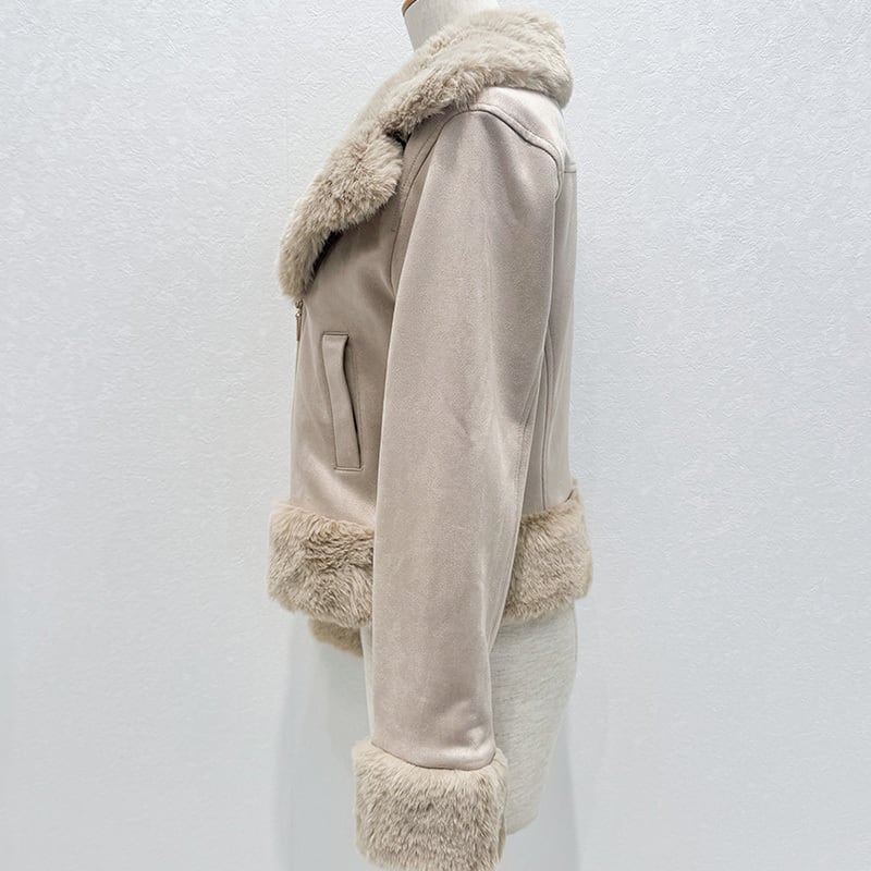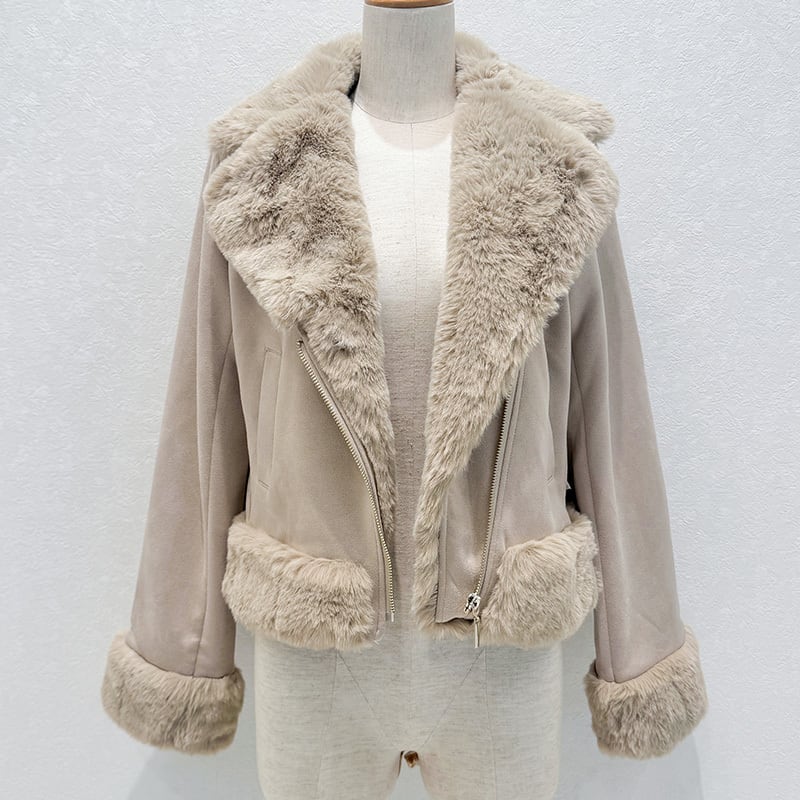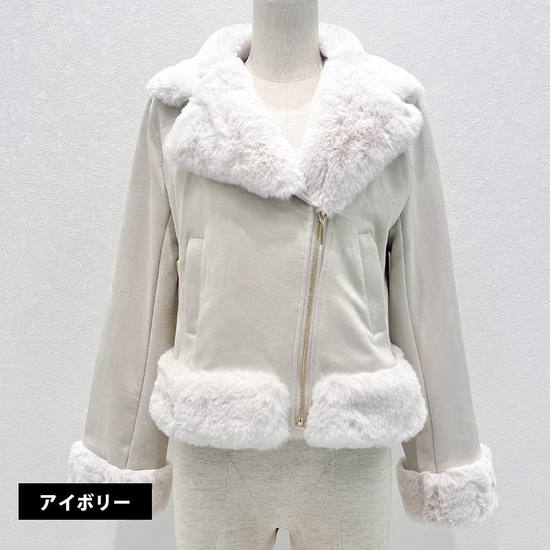 テーラーファー付スエードジャケット レディース ファー付きジャケット 秋冬 フェミニン アウター 高見え ジャケット ファーライダース 女子会コーデ デートコーデ アイボリー グレー ベージュ ピンク 20代 30代 40代