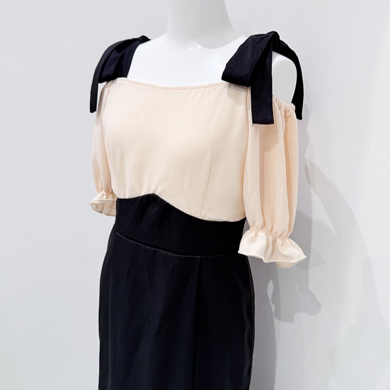 肩のリボンが目を引く、フェミニン度たっぷりのマーメイドワンピース。デコルテをきれいに見せてくれる華奢なネックラインと、ふんわり袖のシフォンが女性らしさをぐっと引き上げてくれます!ボディラインを美しく見せる切り替えと、裾に向かって広がるマーメイドシルエットで、スタイルアップ効果も抜群。特別な日のお出かけやデートにも映える、一枚で主役になれるワンピースです♩