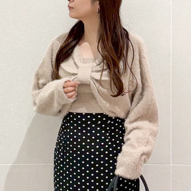 さりげくきらめくラメシャギー素材が可愛い、リボン風デザインのツインニット。立体感のあるバックリボン風シルエットが、後ろ姿まで抜かりなく女の子らしさを演出してくれます。デニムで甘さを程よく引き算しても、スカート合わせでとことんフェミニンに仕上げても◎。一枚で主役級の存在感を放つ、今季注目のニットセットです♩