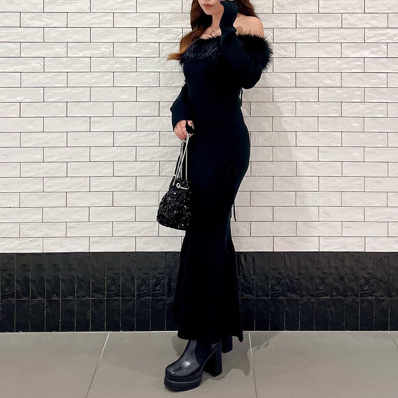 視線を惹きつけるフェイクファーで、一瞬で“特別感”のあるスタイルが完成するニットワンピース。デコルテまわりをぐるっと彩るフェイクファートリムが、顔映りを華やかに見せつつ、女性らしさをぐっと引き立てます。程よくフィットするリブニット素材で、ボディラインはすっきり美しく。サイドのレースアップデザインがさりげないアクセントになり、シンプルながらも周りと差がつく1枚に。裾の切り替えデザインが動きを出してくれるので、歩くたびに大人っぽいニュアンスを演出します。デートや女子会、夜のお出かけなど、“今日はちょっと気合いを入れたい日”にぴったりな主役ワンピースです♩