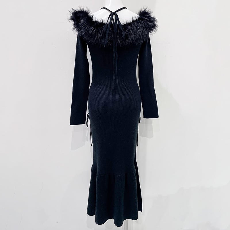 フェイクファートリムニットワンピース レディース ニットワンピース ファー付き ワンピース ブラック 20代 30代 40代