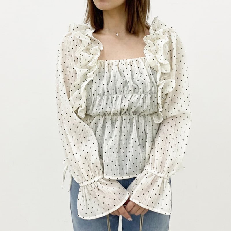 甘さとトレンド感を両立した、ドットシャーリングブラウス♩繊細なドット柄にたっぷりのシャーリングデザインで、着るだけでフェミニンなシルエットが完成!胸元とウエストのシャーリングが自然にメリハリをつくってくれるからスタイルアップ効果も◎顔まわりを華やかに見せるフリルデザインと、さりげないサイドリボンが可愛さをさらにプラス!デニムでカジュアルダウンも、スカートでとことんガーリーも楽しめる主役級ブラウスです!