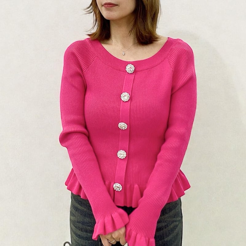 ボートストーンボタン裾フリルニット レディース フリルニット トップス きれいめ ニット ホワイト ピンク ブラック 20代 30代 40代