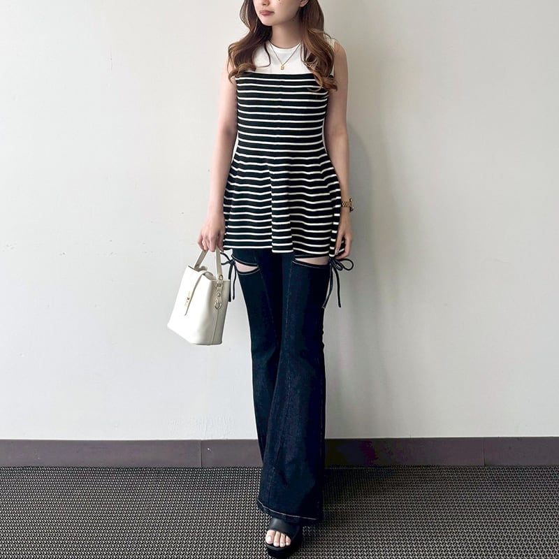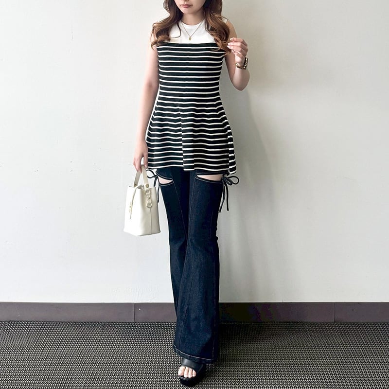 洗練された印象のカーキ・ブラック・ボーダーのノースリペプラムニットは、シーズン問わず着回しができるアイテムです!フレアシルエットがスタイルを美しく見せ、ボディラインを優しくカバーしてくれます◎ 柔らかな素材感で肌触りも良く、リラックスした着心地を実現。一枚着としてはもちろん、ジャケットやカーディガンのインナーとしても役立つこと間違いなしです。