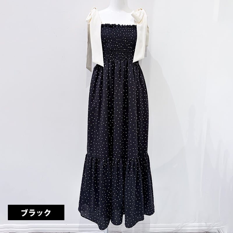 肩リボンドットワンピース レディース 肩リボン 大人かわいい ワンピース ドットワンピース アイボリー ブラック 20代 30代 40代