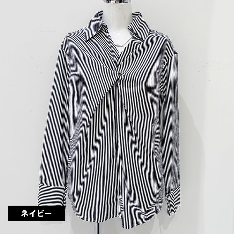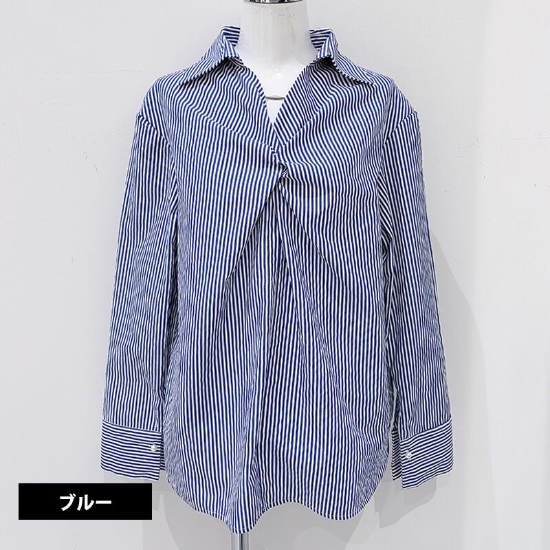 ツイストスキッパーネックレス付ブラウス レディース ストライプ ブラウス ストライプ ブルー ネイビー 20代 30代 40代