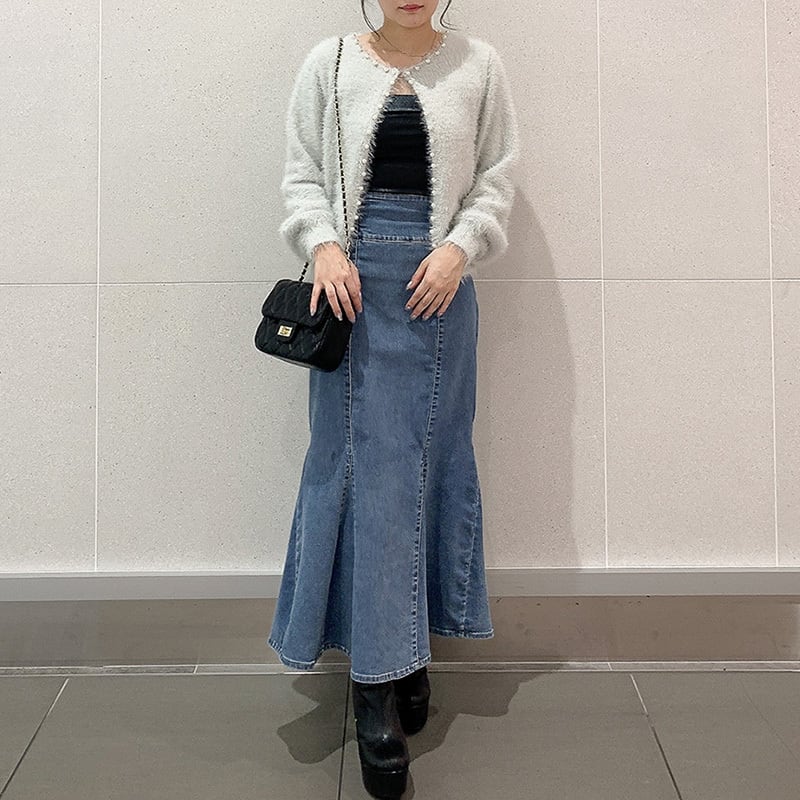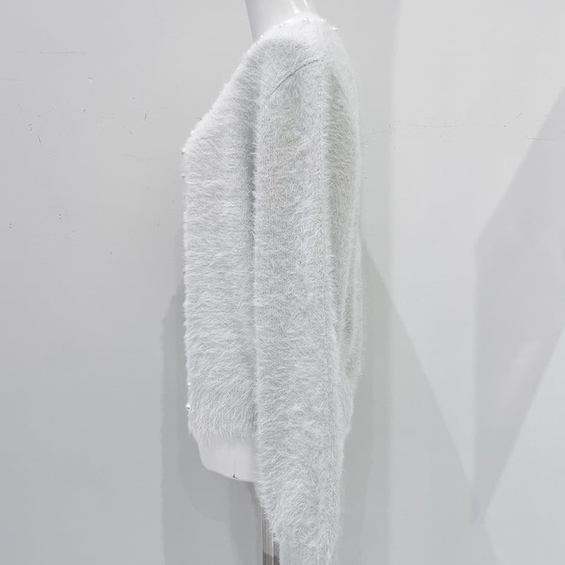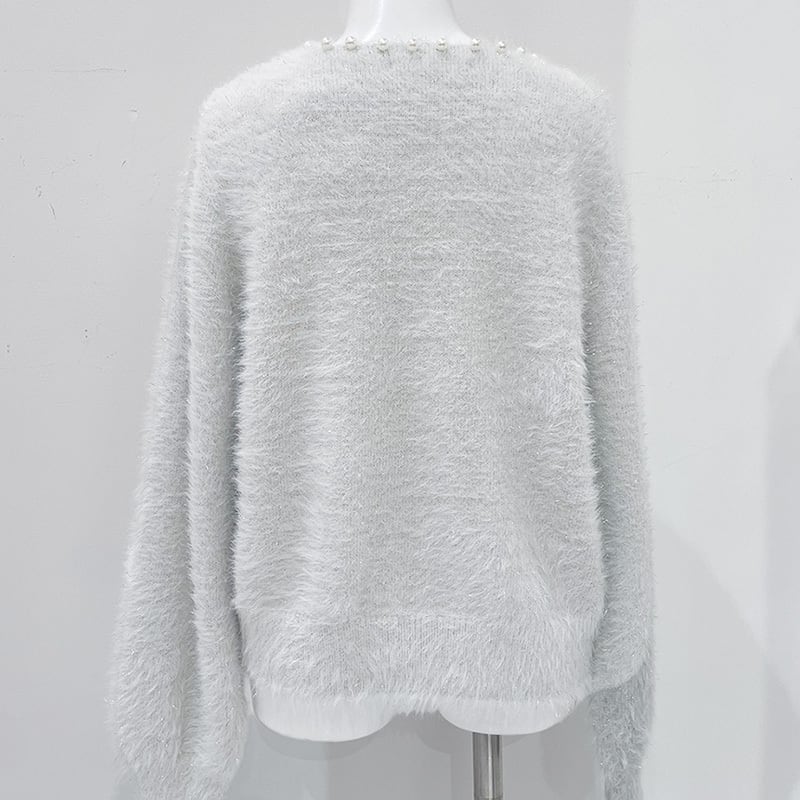 華やかなラメとフェザーのデザインが魅力的なラメフェザーパール付カーディガン。シンプルながらも、パールの輝きとふんわりとしたフェザーが上品さを演出します。ホワイト、グレー、ピンク、ブラックの4色展開で、どのカラーも季節を問わず様々なコーディネートに合わせやすく、デイリーユースから特別なシーンまで幅広く活躍するアイテムです。